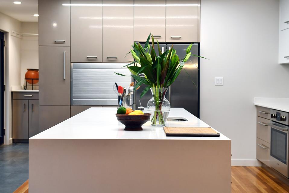A large waterfall island anchors the design of the remodeled kitchen in February 2018 in Chevy Chase, Maryland. (Photo by Katherine Frey/The Washington Post via Getty Images)